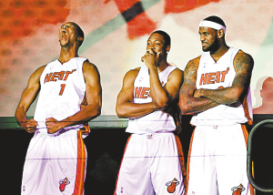| 热火“三巨头”从左至右:波什、韦德、詹姆斯。