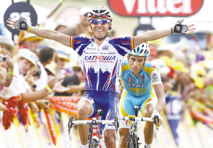 北京时间7月16日凌晨,在2010年环法自行车赛第12赛段的比赛中,喀秋莎车队的西班牙车手罗德里格斯·奥利弗以4小时58分26秒的成绩获得赛段冠军。图为奥利弗(前)在冲刺后庆祝。 新华社发