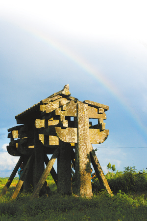 | 罗驿村历经沧桑的节孝坊,与雨后彩虹构成一道美景。 海南日报记者 张杰 摄