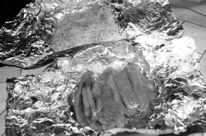只见符开书找出一只铁桶,把装有海鲜的锡纸包放进桶里,然后从土炉里取出烧红的土块,先砸碎再一层层地撒在锡纸包上。根据海鲜品种的不同,撒土的层数也不同,海白、豆芽只需要撒薄薄一层就熟了。