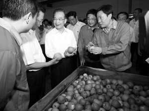 | 7月16日至18日,国务院总理温家宝在陕西省考察工作。这是7月16日,温家宝在陕西华圣果业公司向企业负责人详细询问苹果出口情况。 新华社记者 樊如钧 摄 |