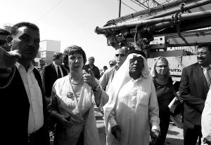 7月18日,欧盟外交和安全政策高级代表阿什顿(前左二)在加沙地带北部参观一个工厂的建设工地。 阿什顿17日在拉姆安拉宣布,欧盟支持巴勒斯坦政府的建国计划,为此欧盟将向巴方提供4000万欧元的经济援助,并将在今年秋季探讨是否继续追加援助数额。新华社发