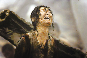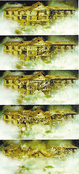 蒋燕鸣:当时唐山大地震实际的发生时间是凌晨4时。所以很多人都是在睡梦中被砸死的。还有很多人来不及逃出来就被房屋埋住了。但为了更好地表现出这场灾难的感觉,我们现在设置了相对多的人在里面。比如宾馆垮的时候有人从窗子里跳出来,但还是被倒下的大梁压住了。现在的场面,已经让观众感受到地震灾害的威力了。是一种心理氛围的营造。