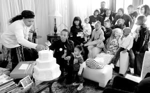 7月18日,南非前总统纳尔逊·曼德拉(坐在沙发上者)在约翰内斯堡与家人一起庆祝自己的92岁生日。 新华社/法新