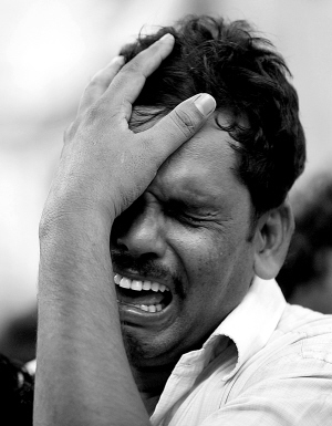 | 7月19日,在印度东部西孟加拉邦苏里一个医院的太平间外,被火车相撞事故夺去亲人的男子悲伤地哭泣。 新华社/路透 |