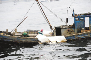 7月19日,渔船在溢油海域使用吸油毡清理海上油污。大连市组织500余艘渔船参与海面清污工作,以求尽快降低因输油管线爆炸造成的海洋污染。另有4艘巡逻船一直坚守在事发水域,监控油污扩散和清理情况,继续扩大布设围油栏。这是输油管道爆炸造成大连海域污染后当地启动的最大规模海上清污行动。 新华社记者 任勇 摄