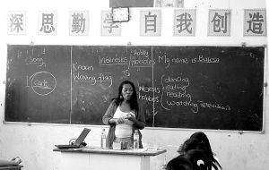 | 7月19日下午,一名外国留学生在给定安岭口中学学生上英语课。本报记者 洪宝光 摄 |