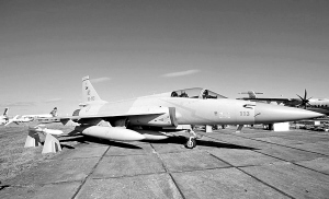 | 展示中的“枭龙”战机,可携带装有冲压发动机的空空导弹。 |