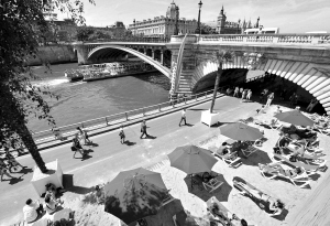 7月20日,在法国首都巴黎的塞纳河畔,人们在“巴黎海滩”享受夏日阳光。 当日,为期一个月的“巴黎海滩”拉开帷幕,进口沙子铺成的沙滩、露天游泳池、草坪等设施造就了免费的娱乐活动场地,为市民与游客提供夏日消暑的“海滩”休闲处。 新华社/路透