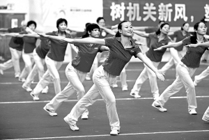 | 20日,省直机关第三届职工运动会开赛,图为选手在大众广播操的比赛中。