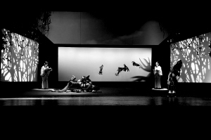 据悉,《狼孩》描述的是一只哺乳中的母狼与被抢来的襁褓中的小女孩共同生活所引发的故事。演出一开场,舞台上呈现出一片广袤的森林,近台上偶有群狼在劲舞,而远台,超大皮影背景上则有一只头狼傲立,舞台左右的皮影侧屏和舞台上方的多媒体投影,又展现出了不同的森林环境,演出一开始,就将观众带入到一种从未体味过的舞台意境之中,这样的多时空舞台结构,打破了传统皮影戏画面单调、呆板的表现形式,通过改革创新,将人偶与多媒体有机融入,给了观众超大的时空感受,是完全不同于传统舞台演出的一台大戏。