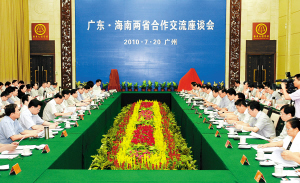 本报广州7月20日电(特派记者谭丽琳 陈成智)今天下午,广东海南两省举行合作交流座谈会,共商互利共赢、合作发展的大计。中共中央政治局委员、广东省委书记汪洋提出,联手抢抓机遇,全面推进两省多层次、多形式、全方位的经贸合作,把粤琼两省合作打造成我国相邻省份区域合作的典范。