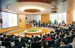 | 七月二十日,海南省党政考察团在广州市珠江新城富力中心考察广州市城市规划建设情况。 本报记者 宋国强 摄 |