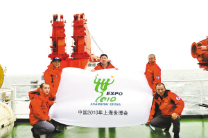 北京时间7月20日13时13分,我国第四次北极科学考察队乘坐“雪龙”号极地科学考察船穿越北纬66度33分的北极圈。为纪念这一历史性时刻,考察队员们在“雪龙”号上举行“问候祖国、祝福世博”的庆祝活动,向祖国人民问好,为上海世博会遥送一份来自北极的祝福。新华社发