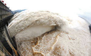 20日清晨,流量高达7万立方米/秒的特大洪水,直扑三峡大坝。经过大坝拦截,浑浊的水柱从9个泄洪深孔喷涌而出,震耳欲聋,在坝下激起漫天水雾。桀骜不驯的洪水经过三峡和葛洲坝间水域后,变得温顺许多。