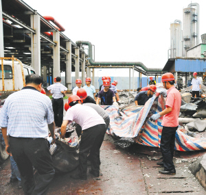 贵州兴义一化工厂爆炸死5人 7月22日,贵州省兴义市一化工厂原料输送管道在检修过程中,突然发生爆炸,已确定造成5人死亡,至少4人受伤。据了解,接报后,当地迅速组织人员实施抢险救援。图为事故现场。 新华社发