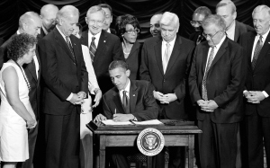 | →7月21日,美国总统奥巴马(中)签署金融监管改革法案。 新华社/法新 |