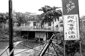 在仅仅靠近“渔家庄”大约30米处,便有另外两家名为“亚七餐饮”和“阿九百草渔园”的大排档也建立在河道内,而且在它们旁边与江面相连的沟道内,水面漂浮着大量垃圾,尽管被丝网拦住,但沟道水面已成黑色,老远就能闻到一股臭味。而且,就在大排档旁边,还饲养着一群群鸭子、鸡等禽畜,让整个水面变得更脏。