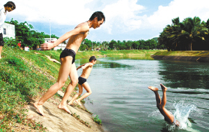 ↑近日,七八名10岁左右的孩子,在儋州市那大镇军屯段的水渠游泳、跳水嬉戏。其中,一位孩子的妈妈急匆匆赶到水渠边喊孩子上岸回家,呵斥孩子在这里游泳很危险。据了解,从松涛水库引出的水渠途经儋州多个乡镇,近年已发生多起学生溺水身亡事件。 本报记者 苏晓杰 摄