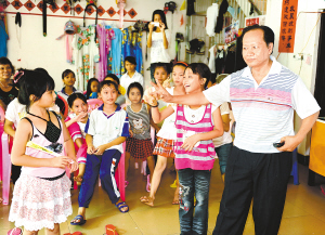 ←7月19日,琼海嘉积镇,一幢小楼里不时传来孩子们稚嫩的唱腔。一位老师正在辅导放暑假的孩子们学习琼剧表演。