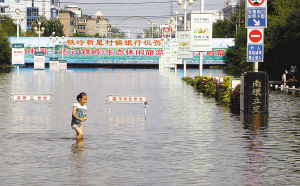 | 7月22日,一个小女孩走过辽宁省铁岭市被水淹没的地下通道。 新华社发