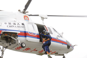 7月22日,交通运输部北海救助飞行队S-76直升机赶到模拟事故现场上空悬停,救援人员带着一名重伤人员被吊上飞机。 当日,“辽宁-2010”高速公路直升机救援演习在沈阳至大连高速公路举行。这是中国首次在高速公路动用直升飞机对突发重特大事故进行救援演习,交通运输部救助打捞局、辽宁省政府应急办等20个单位参演。新华社记者 徐扬 摄