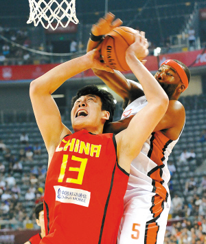7月24日,2010年姚基金慈善义赛在北京国家体育馆进行。最终,中国男篮以95:101不敌美国明星男篮。图为苏伟(左)在比赛中上篮受阻。 新华社发