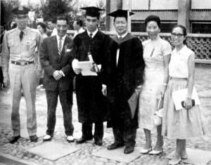 | 杜维明先生(中)与家人在台湾东海大学毕业典礼上与吴德耀校长合影。 |