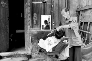 | 廖家理发店第三代传人廖方林手握机械剃刀,正为老者剃头。