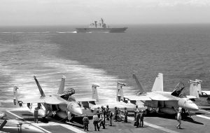7月26日,美国海军“乔治·华盛顿”号航母上的F/A-18F超级大黄蜂战机准备起飞。韩国和美国联合海上军事演习当日进入第二天。韩国军方官员说,当天演习重点为反潜。 新华社/路透