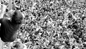 7月24日,在德国西部杜伊斯堡,人们试图爬上栏杆躲避拥挤。 新华社/法新 |