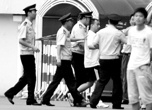 | 7月25日,在山东青岛进行的中超联赛第14轮的一场比赛中,青岛中能队主场以0比2不敌上海申花队。图为飞踹主裁判的球迷被警察带走。