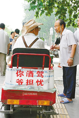 西安82岁的张大爷因电动三轮车上的自制车贴在网上走红,“你酒驾,爷担忧”的标语逗乐了不少网友,被尊称为“担忧爷”。他自己说,因为他的电动三轮车曾被酒驾的人开车追过尾,想提醒他人,口头劝说被嫌唠叨,贴上标语效果比较好。 (来源:西部网)
