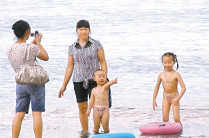 三亚暑假亲子游不断升温。家长们通过“亲子游”活动,让自已的孩子扩大视野,放松心情,增长知识。图为两位母亲带着孩子在海边游玩。 特约记者 孙清 摄