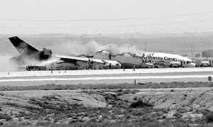 机上具体人数不详 这张手机拍摄的照片显示,德国汉莎航空公司一架货机7月27日在沙特首都利雅得的哈立德国王国际机场坠毁。 据阿拉伯卫星电视台援引沙特民航局官员的话说,货机驾驶员和副驾驶员已经被送往医院抢救。目前尚不清楚货机上具体人数。 新华社/法新