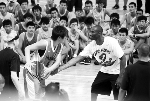 | 7月27日,NBA湖人队球星科比·布莱恩特(右)在长春工业大学体育馆向学生们传授球技。 新华社发 |