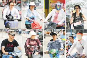 | 山西省太原市区市民们防暑防晒的拼版图片(7月27日摄)。入伏以来,山西省太原市持续高温,市民们“全副武装”出行应对高温天气的“烤”验。 新华社记者 詹彦 摄 |