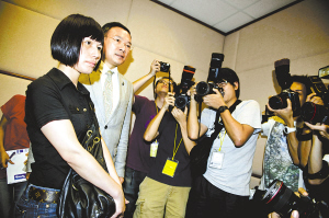 7月27日,香港导游李巧珍(左一)在记者会上。 当日,涉嫌强迫内地游客购物并辱骂游客的香港导游李巧珍首次公开露面,她在记者会上称对事件非常后悔,并郑重向内地游客和香港市民道歉。 新华社记者 吕小炜摄