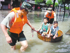 7月27日,在台州市路桥区马铺路,边防官兵转移受洪水围困的群众。受台风“灿都”残留云系影响,浙江省沿海地区从24日开始出现降雨,温州、台州、宁波等地普降大到暴雨,局部大暴雨。降雨造成台州市部分区域积水成涝,群众出行困难。 新华社发