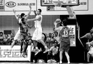 | 易建联(左三)在比赛最后时刻防守。 新华社发 |