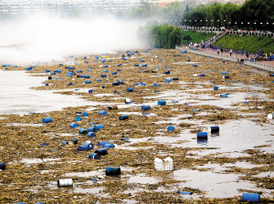 这是7月28日拍摄的漂浮在松花江中的化工厂原料桶。