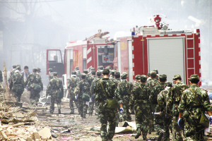 | 7月28日,救援人员进入事故现场进行处置。