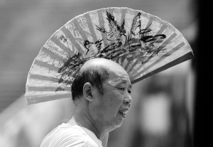 7月29日,在重庆市渝中区人民广场,一位市民用扇子抵挡刺眼的阳光。当日,热浪席卷重庆,主城区最高气温达39℃,部分区县气温超过40℃。 新华社发