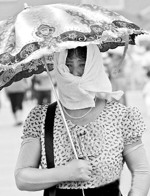 7月27日,天安门广场上,一位游客为了避暑,打着遮阳伞,穿着套袖,并用毛巾蒙住头。 新华社发