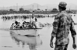7月28日, 吉林市部分乡镇被淹房屋被毁,沈阳军区某部战士用冲锋舟营救灾民。 新华社发