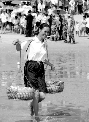 夫妻挑鱼搬鱼接力赛奖金2万元,各个渔村都派出了最精干的选手,还带上村里的啦啦队助威,为奖金也为村庄的荣誉。小组赛第一轮开始,5对选手整齐划一地站在了各自的跑道上。裁判一声令下,5位女选手先开跑了,第三跑道的渔家女很快处在了第一的位置,眼看要到终点了,谁知脚下一滑,人翻鱼撒,这一失误不打紧,翻倒的鱼篓又把跑在第二名的选手碰倒。夫妻挑鱼搬鱼接力赛变成“女子短道速滑”,原本领先的选手把胜利拱手“让”了出来。观众席上有惋惜的、有欢呼的,更多的人则享受着比赛带来的欢乐。