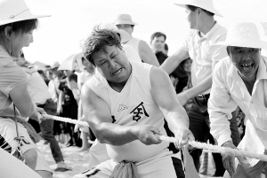 大喇叭里宣布拔河比赛开始了,站在高坡上的人纷纷冲到沙滩上,急促的脚步掀起滚滚沙尘。