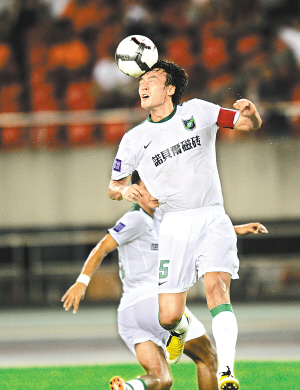 | 7月31日,在中超联赛第16轮比赛中,杭州绿城队队员杜威头球解围。