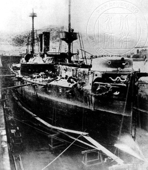 | 北洋水师网站提供的镇远号装甲舰照片,锋锐的冲角之后可以看到舰首飞龙纹后方横放的大锚 |