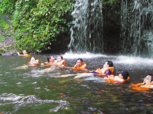 根据安排,峡谷探险需要渡河到对岸,再从水电站上游启程。可是怎么过河?我们此行的教练们乐坏了,他们催促大家赶紧下水。众人手拉手排成一条直线,摸索前行。还没有探险,我们倒先体验了一下万泉河水的清凉。